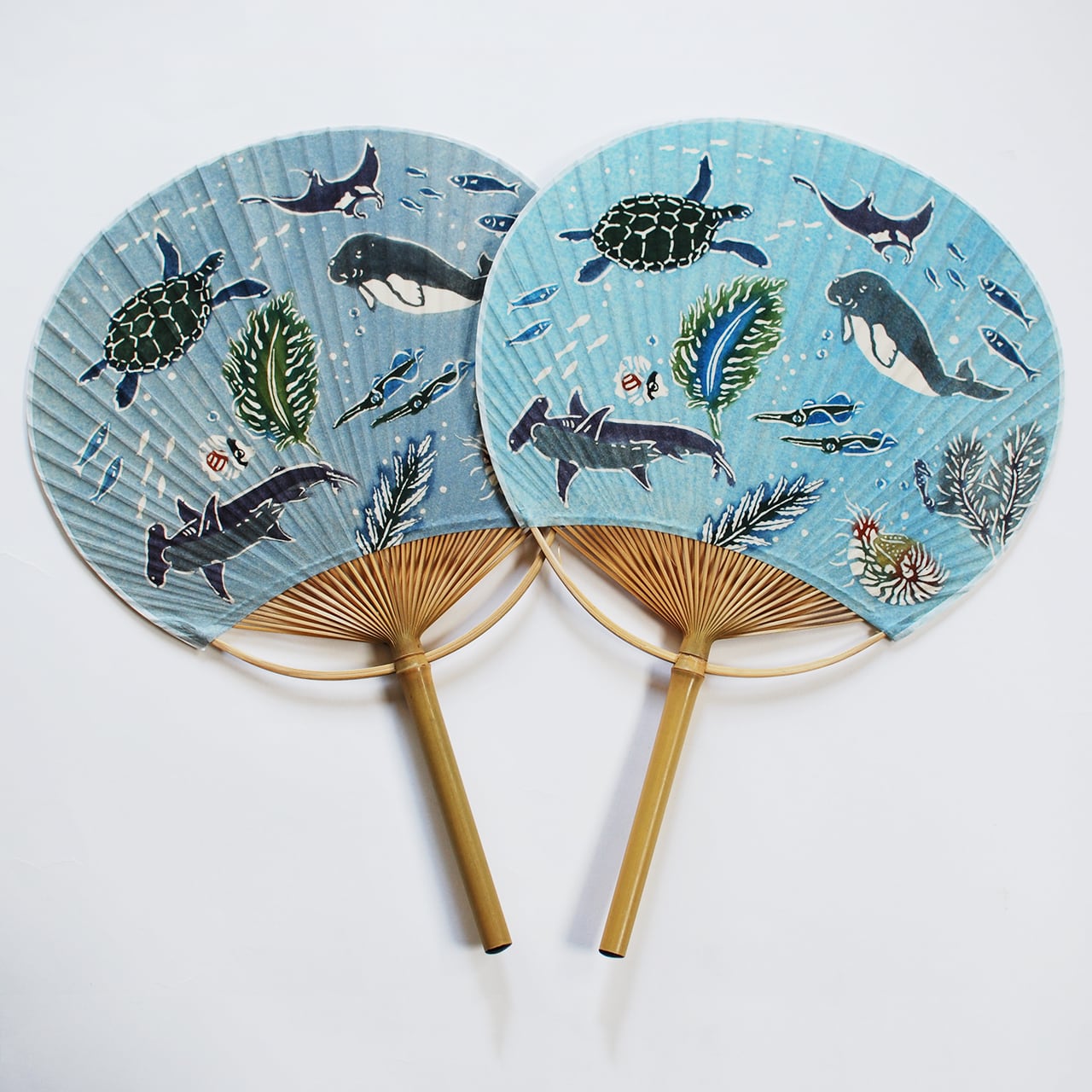 型絵染めで染めた和紙を、房州うちわに仕立てました。 写真は背景が水色ですが、実物は背景がグレーです。(写真入れ替えます) 海のいきものたちがモチーフの楽しいうちわです。 裏にはペンギンの模様が染めてあります。 色違いで背景が薄い藍色のものも 大振りの団扇で、良い風が来ます。